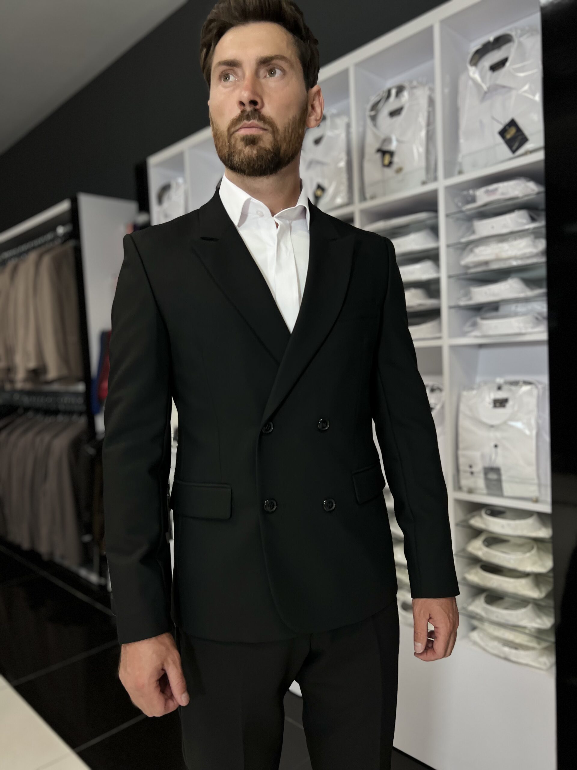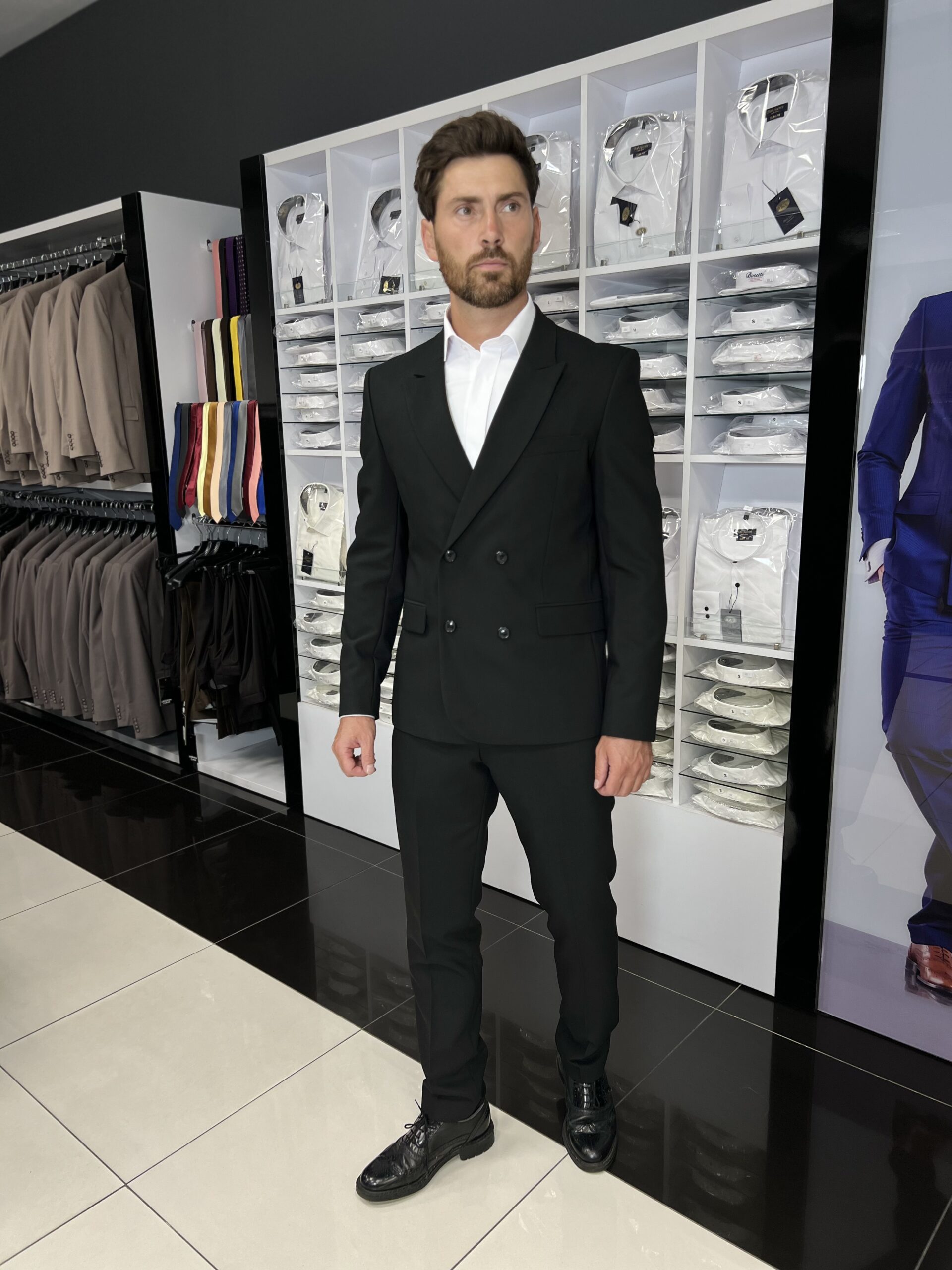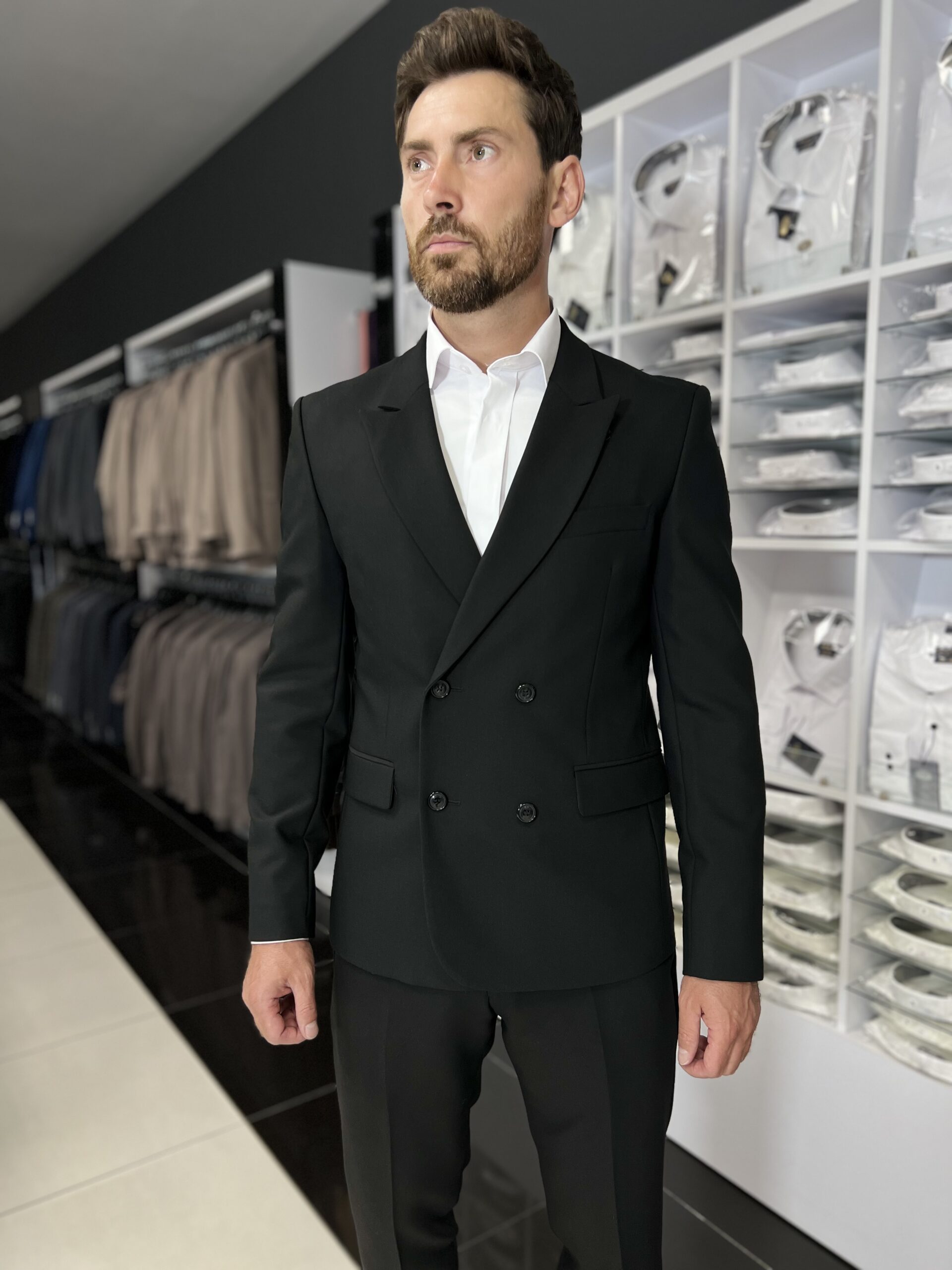 Двобортний чорний костюм