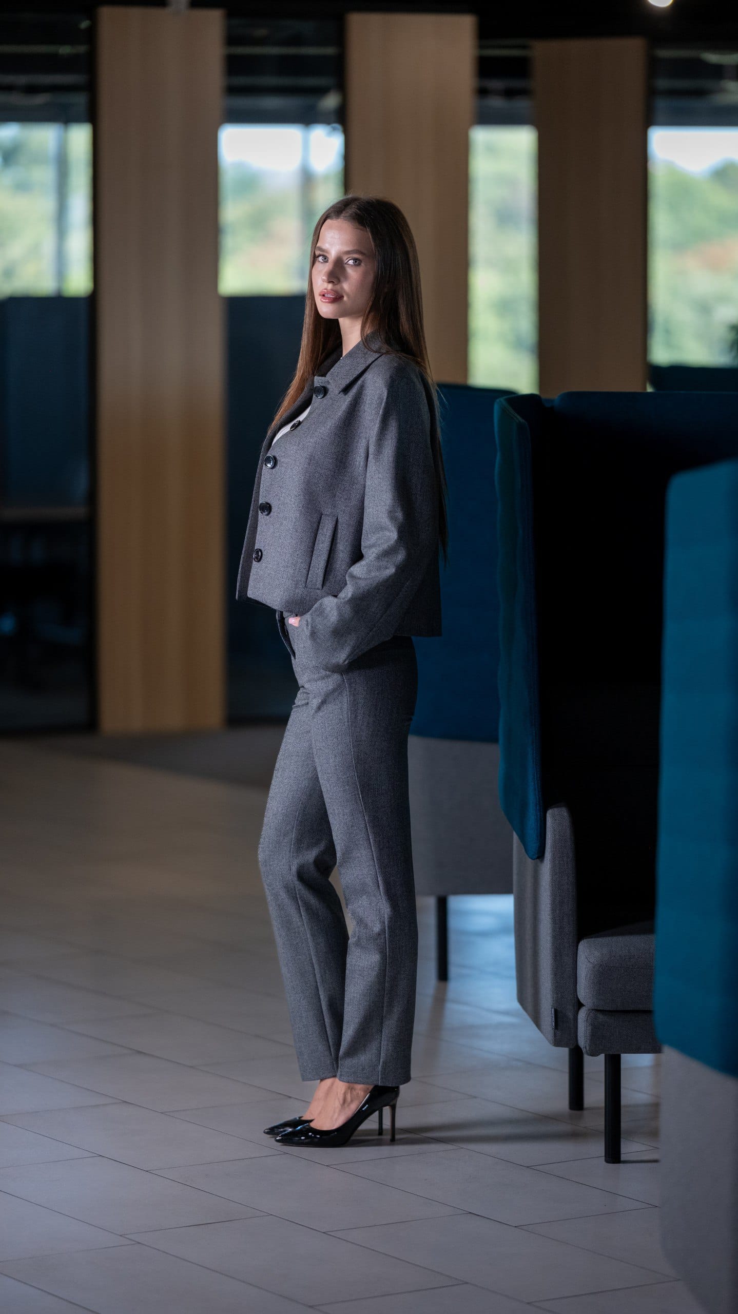 Сірий трикотажний джемпер-поло та темно-сірі класичні штани