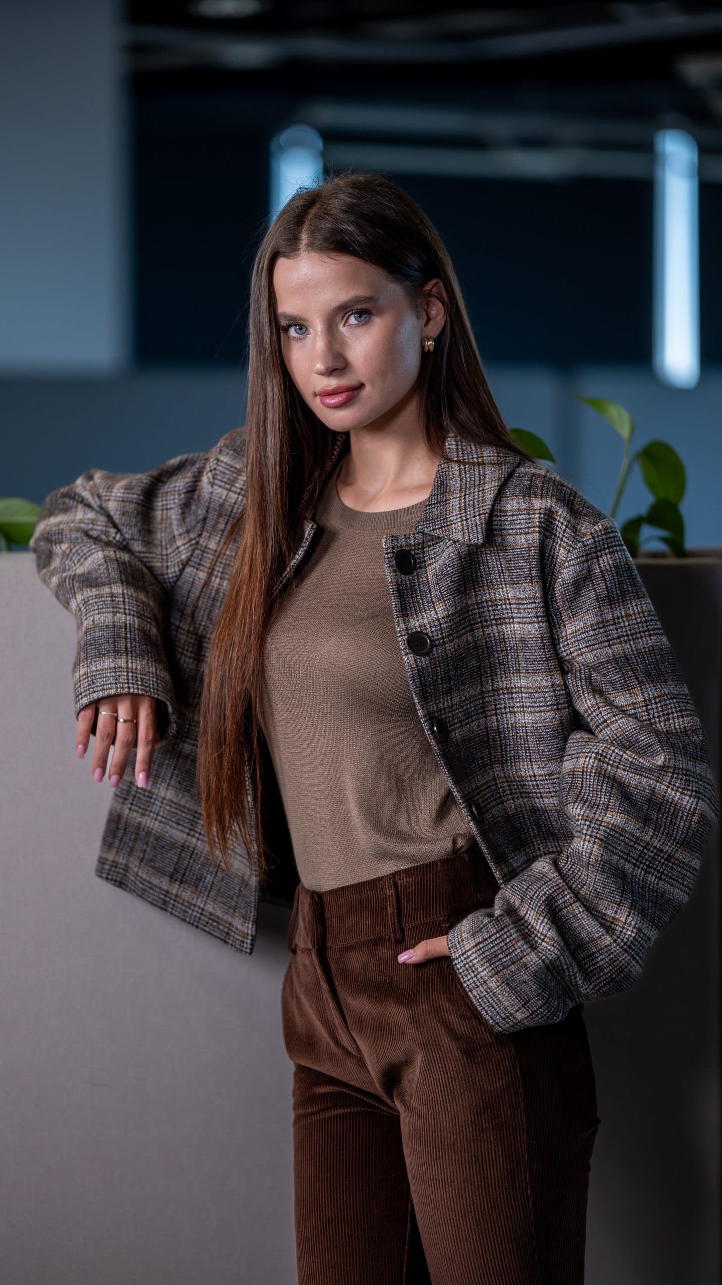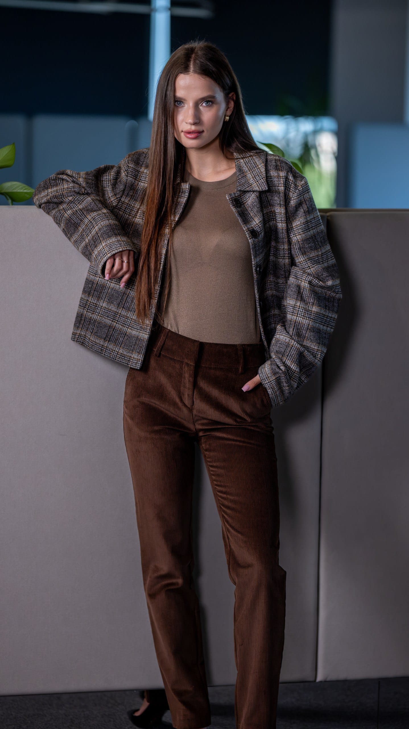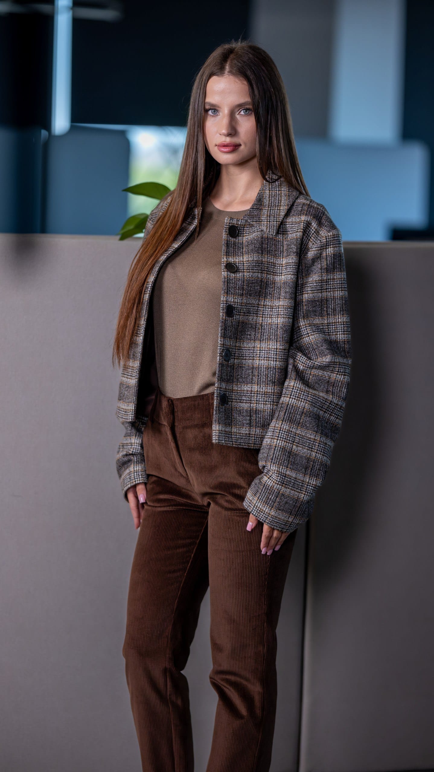 Куртка жіноча коричнева в клітинку у коричневому кольорі. Дизайн у клітинку. Склад: 90% вовна, 5% поліестер, 5% віскоза. Підходить для всіх сезонів. Для прохолодної погоди та щоденного носіння. Поєднується зі штанами, піджаком і светром.