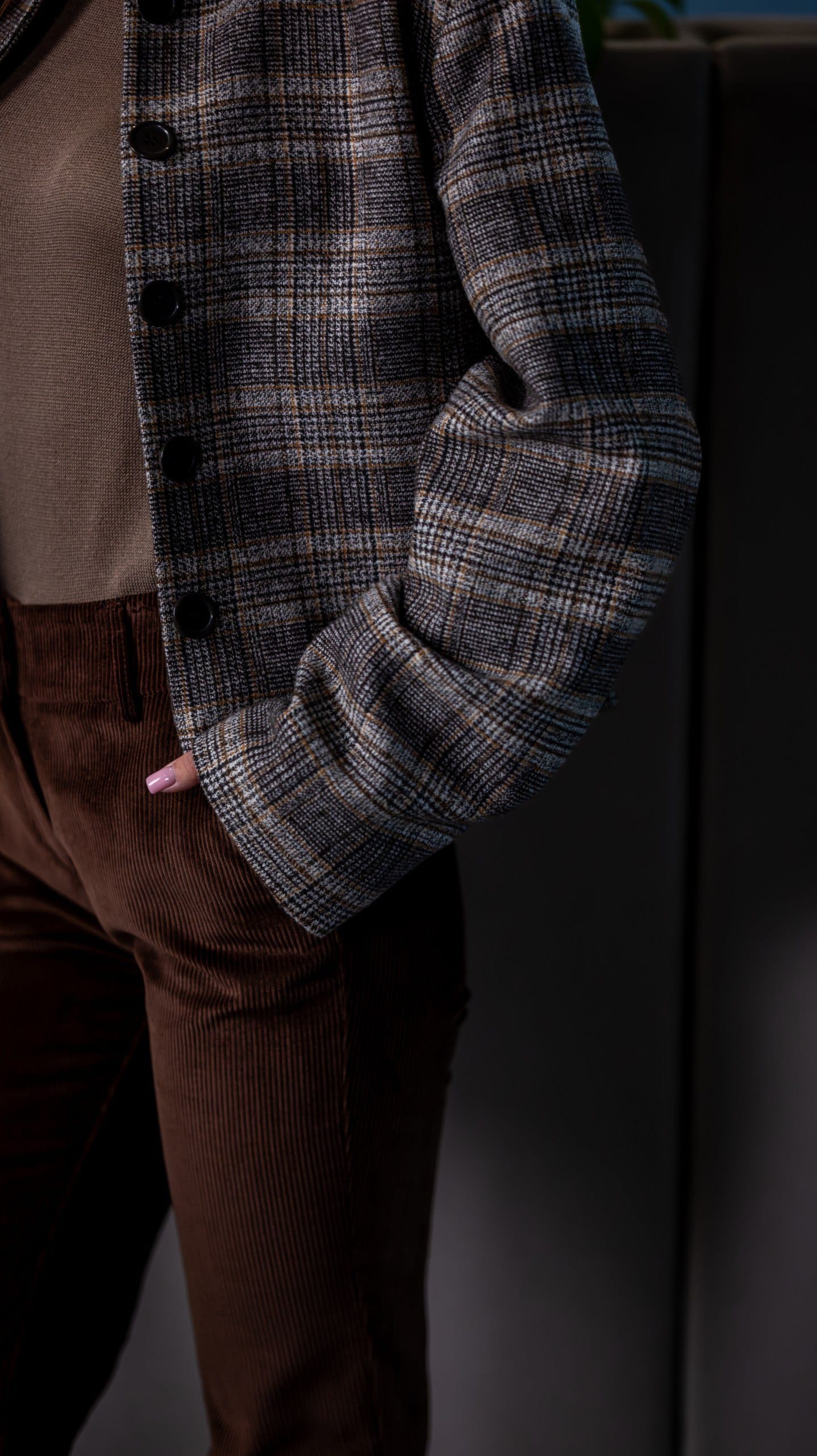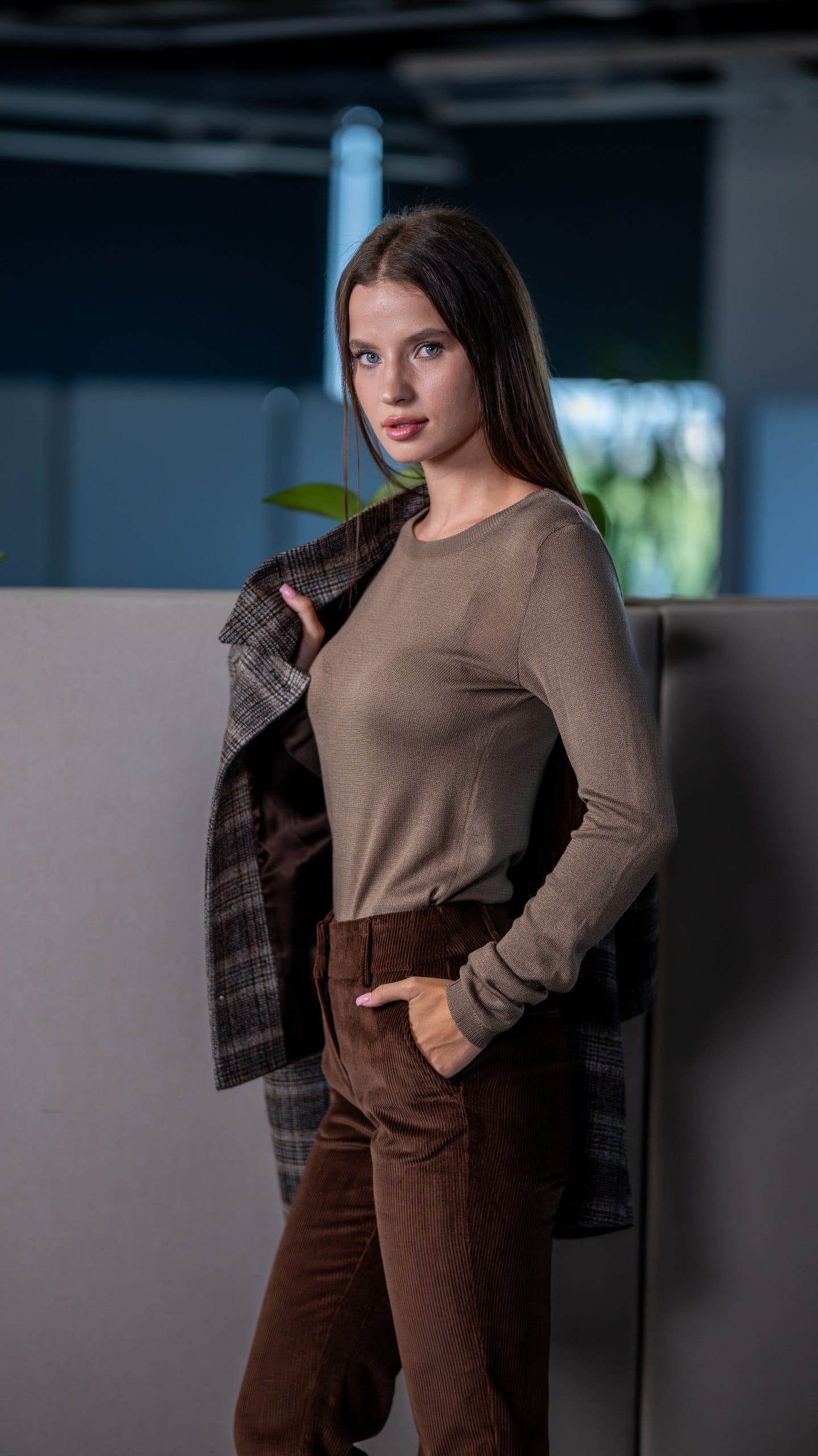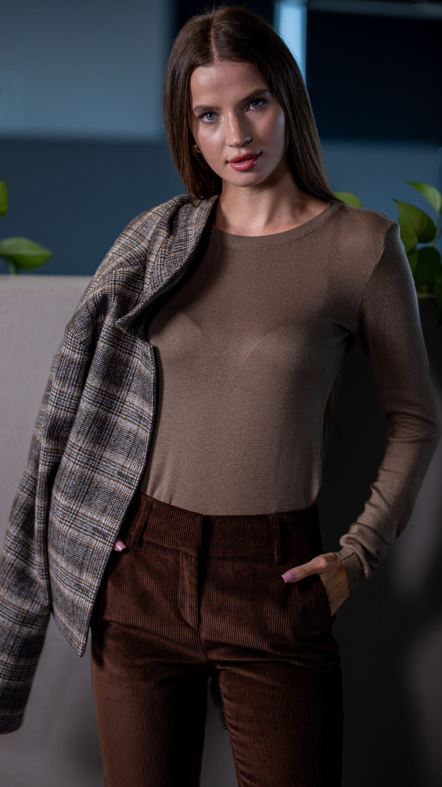 Куртка жіноча коричнева в клітинку у коричневому кольорі. Дизайн у клітинку. Склад: 90% вовна, 5% поліестер, 5% віскоза. Підходить для всіх сезонів. Для прохолодної погоди та щоденного носіння. Поєднується зі штанами, піджаком і светром.