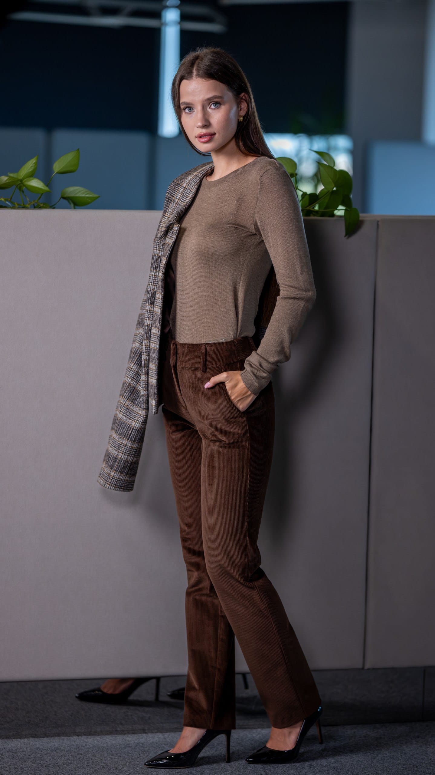 Трикотажний лонгслів у рубчик і вельветові штани