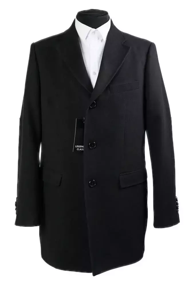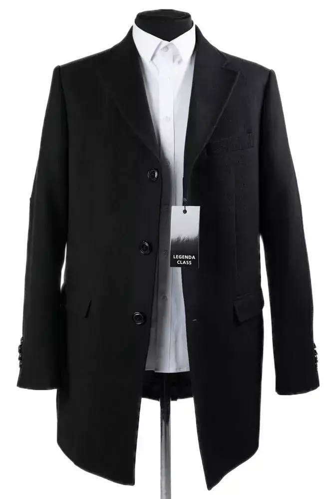 Пальто чоловіче чорне однотонне осінь-зима у чорному кольорі. Однотонний дизайн. Прямий напівприталений силует. Прямокутний лацкан. Склад: 60% вовна, 25% віскоза, 12% поліестер, 3% еластан. Підходить для сезону осінь-зима. Для прохолодної погоди та щоденного носіння. Поєднується зі штанами, піджаком і светром.