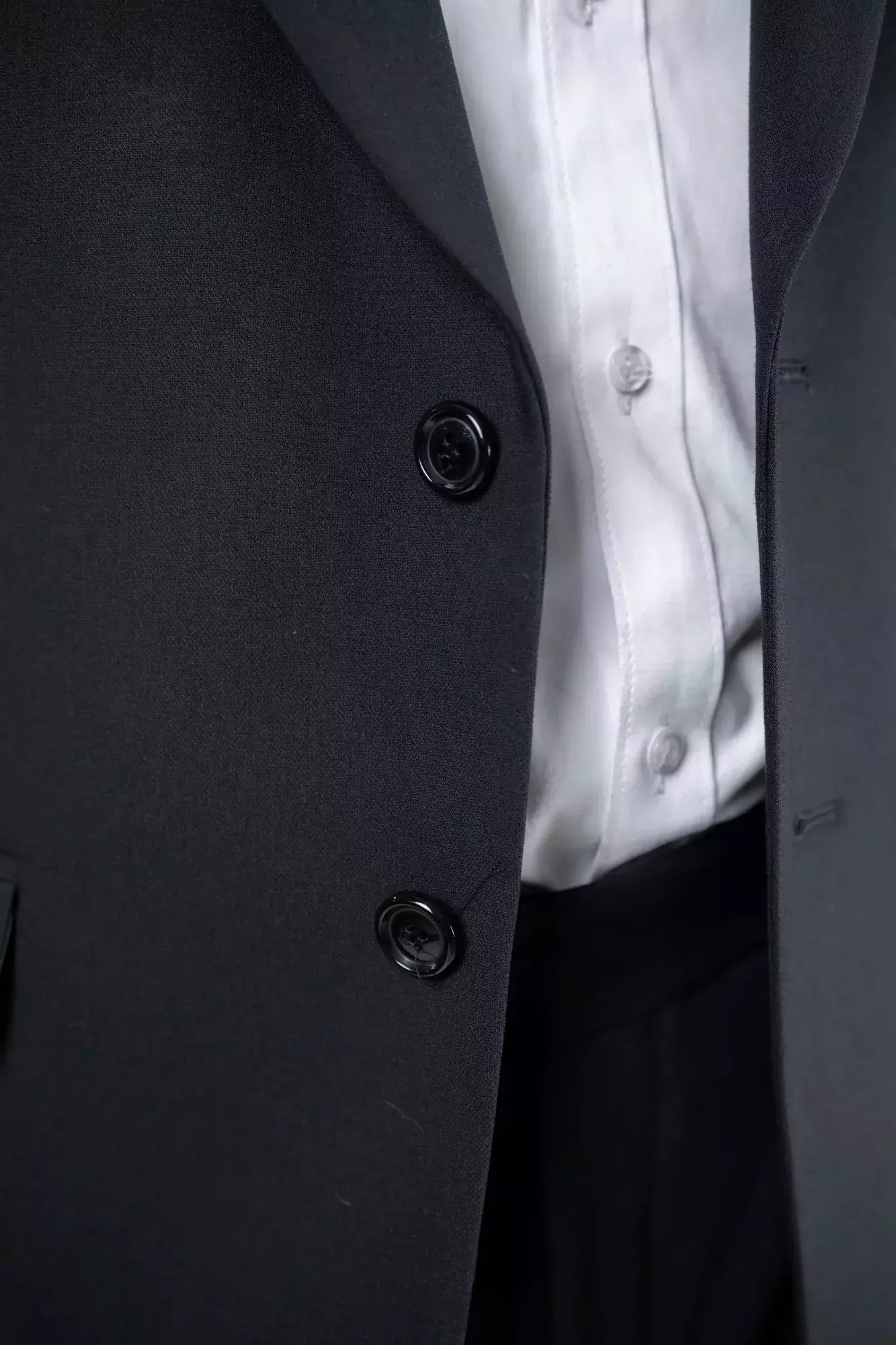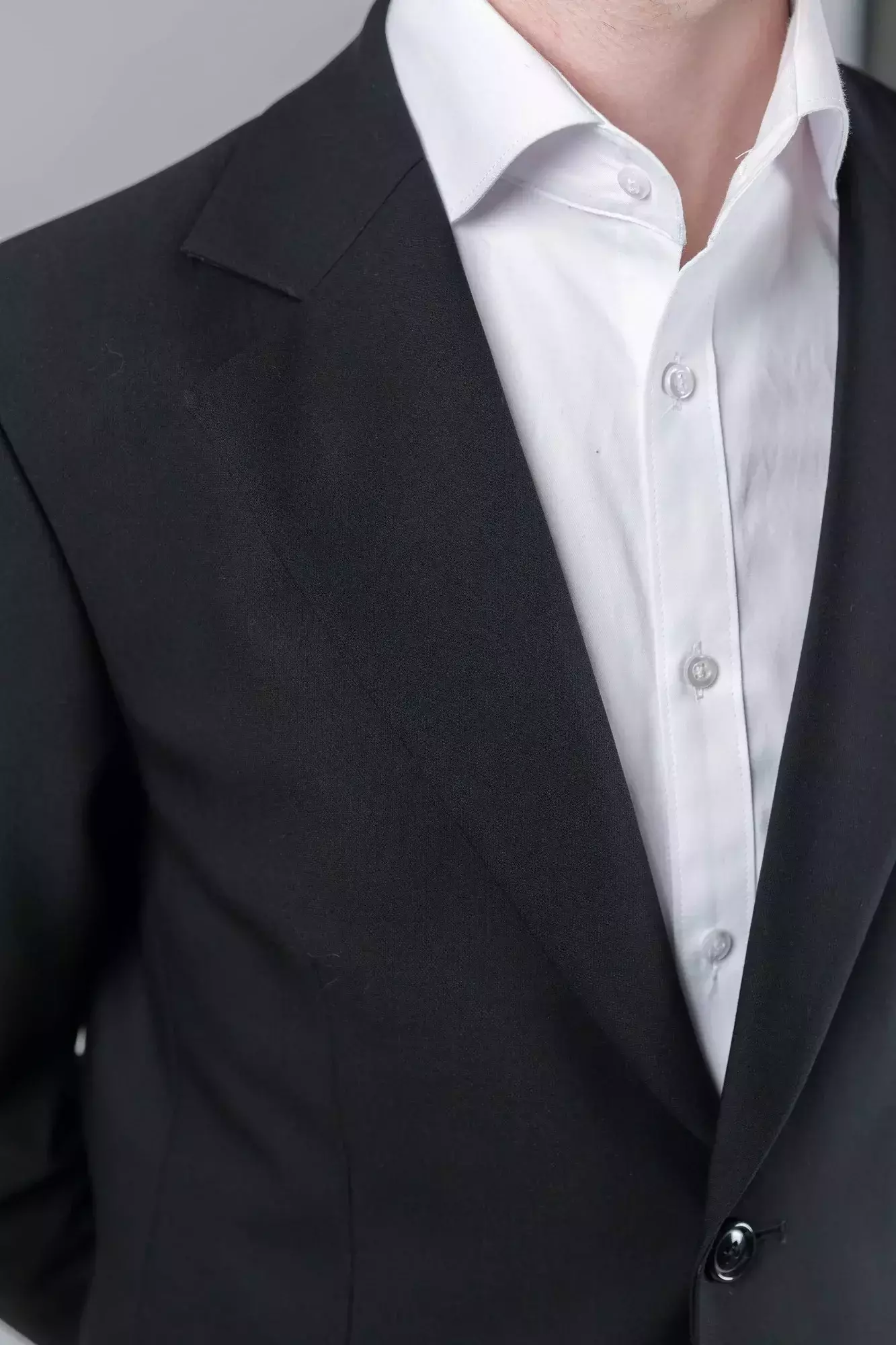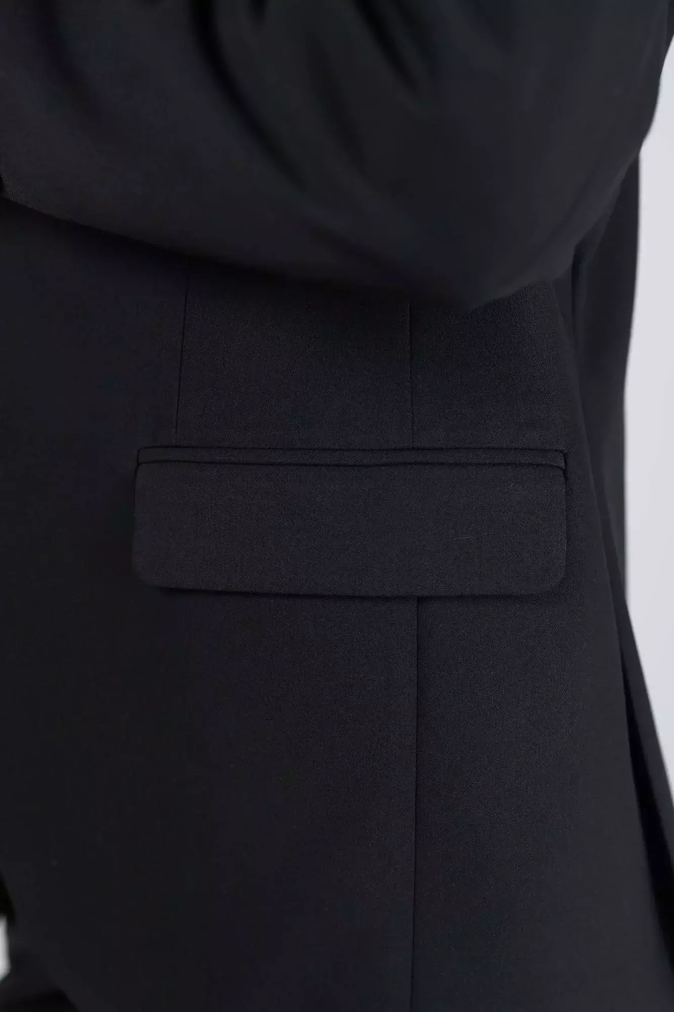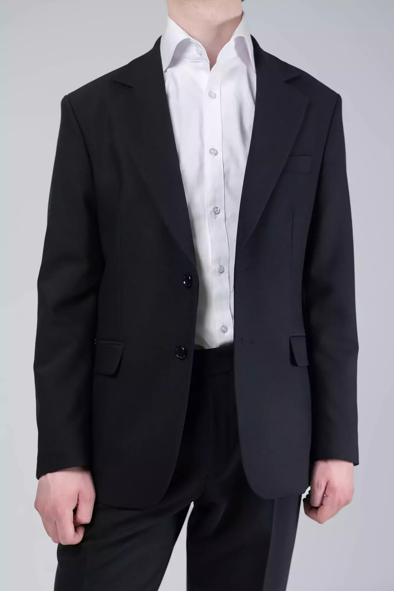 Чорний однобортний піджак Tenebris LR 1 у крої regular fit — вільніший і комфортніший у повсякденній носці, ніж модель 1028. Модель отримала значно ширший лацкан, лаконічний однотонний дизайн і класичні деталі, що роблять її універсальною для роботи, подій та щоденного носіння.