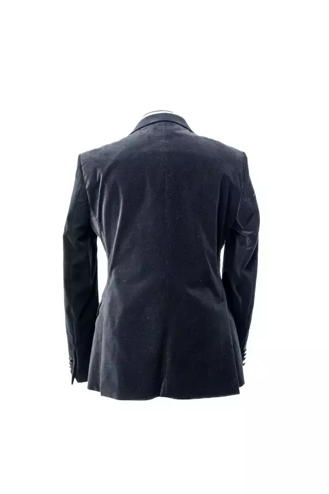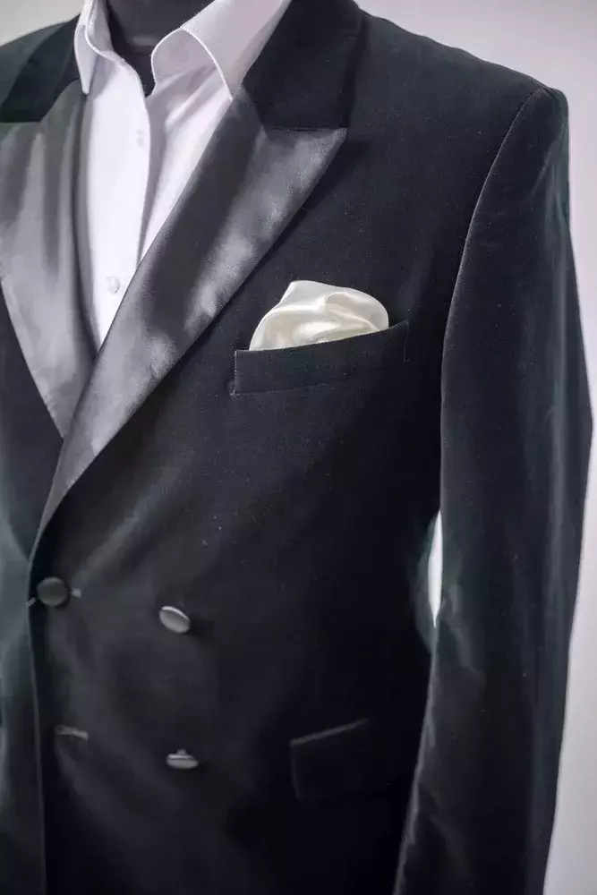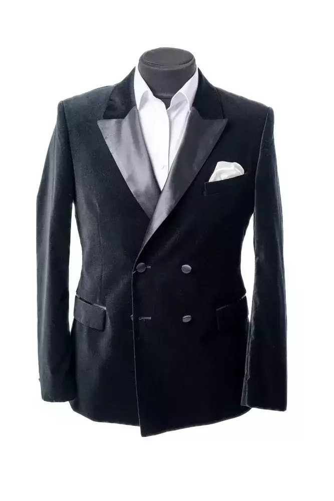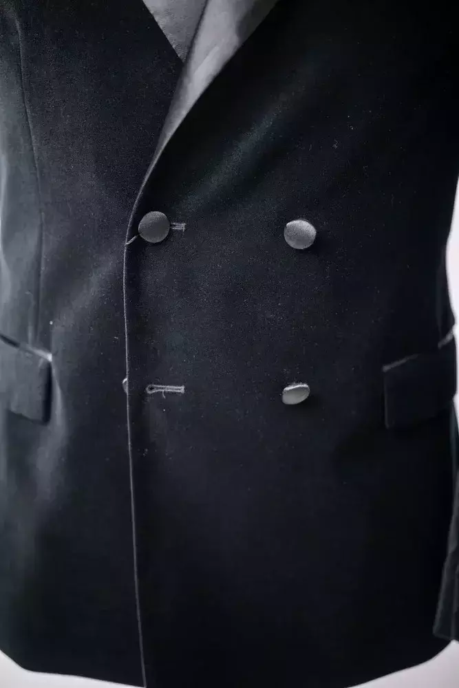 Чорний двобортний піджак із велюру — річ, яка одразу виглядає “дорого” і тримає образ. М’яка фактура велюру красиво ловить світло, а гострі лацкани додають характеру та роблять силует більш зібраним. Ідеально під вечірні виходи, події та ситуації, коли потрібен ефектний вигляд без зайвих деталей — просто сорочка/гольф і акуратне взуття.