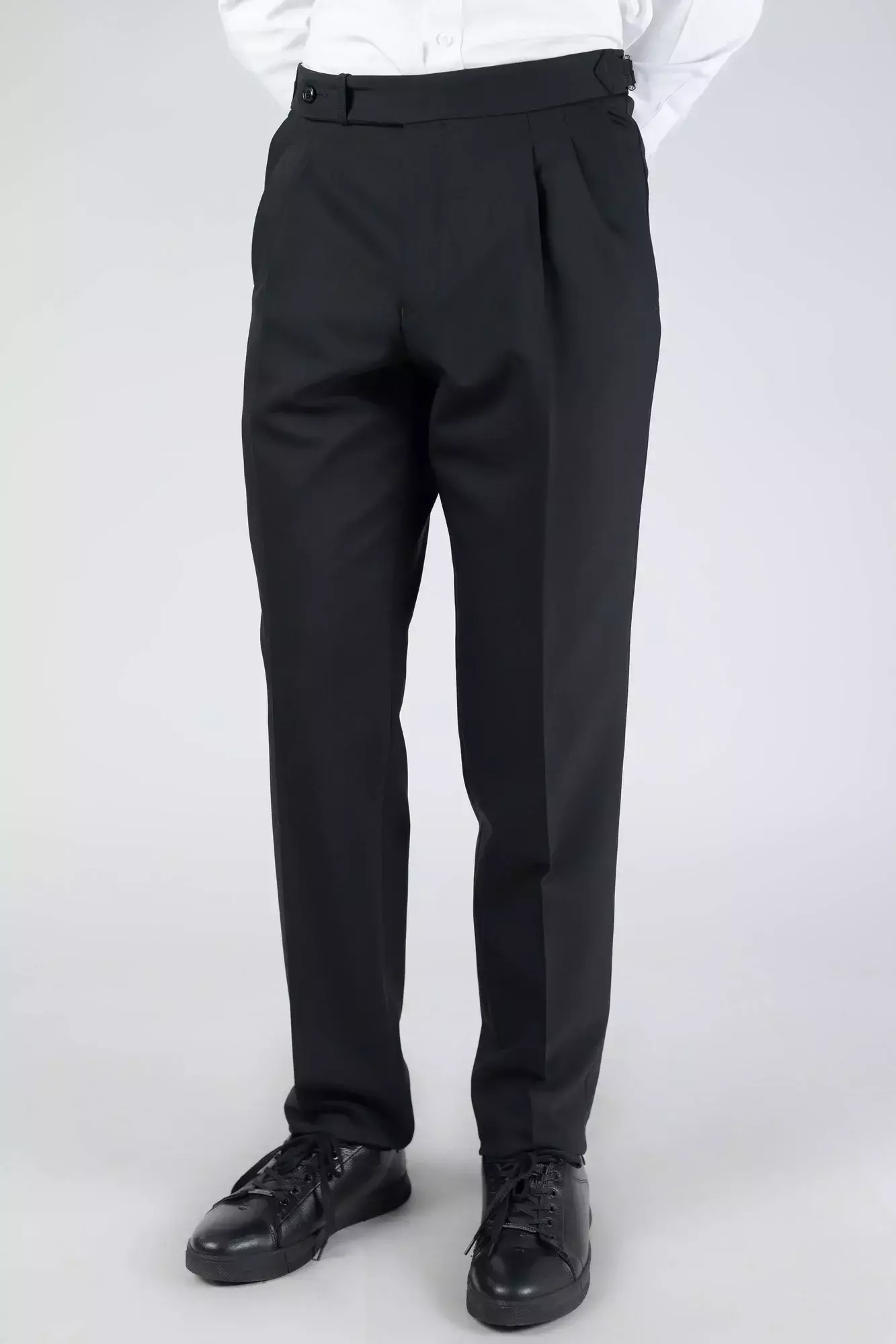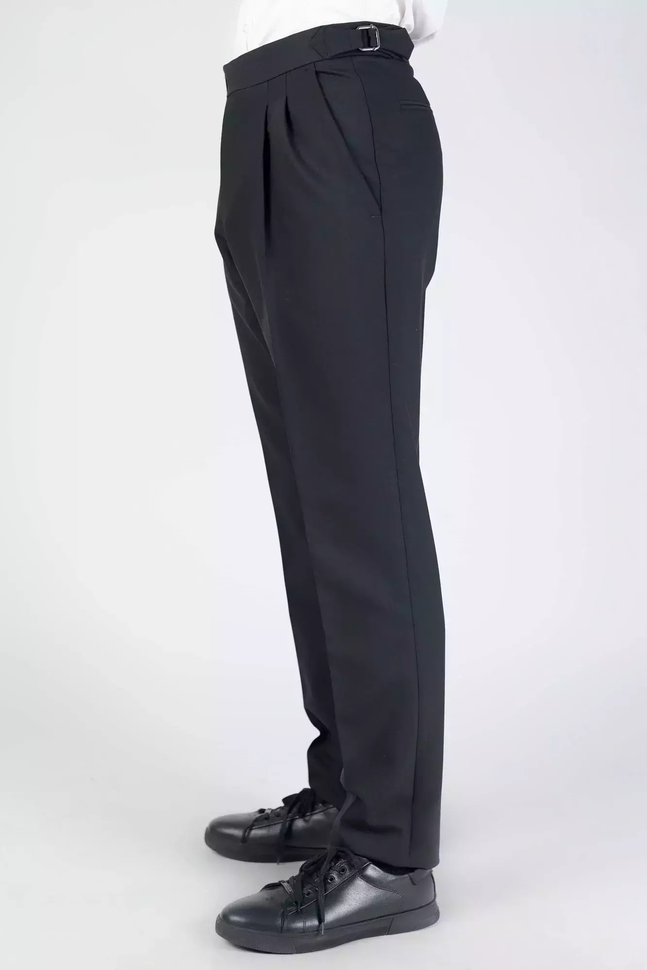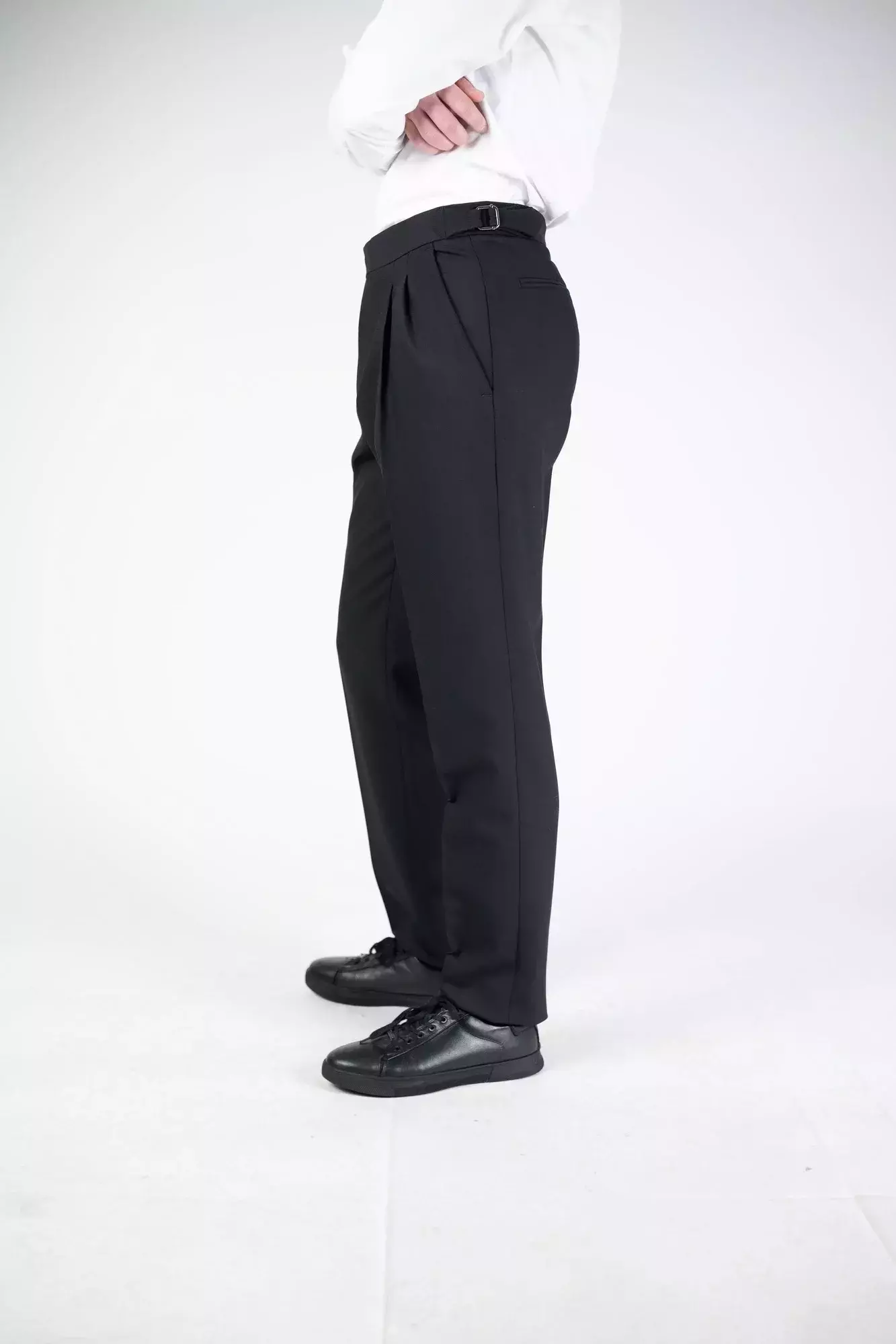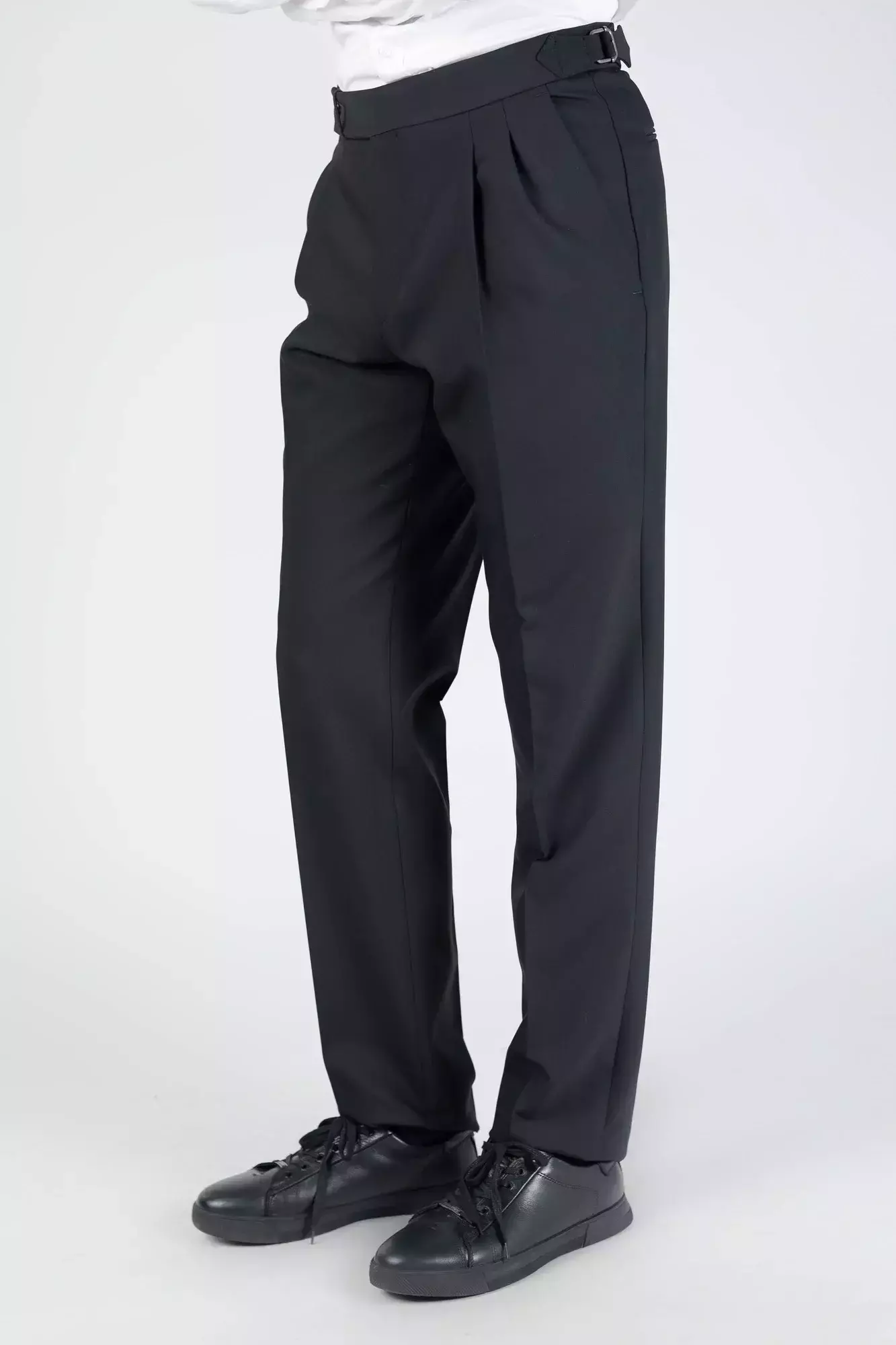 Чорні штани Tenebris LR 2 — значно вільніші за модель 43021 та мають високу посадку, що дозволяє носити їх без ременя. Модель поєднує комфортнішу посадку, лаконічний однотонний дизайн і класичний характер, тому добре підходить як для костюмного комплекту, так і для щоденного носіння.