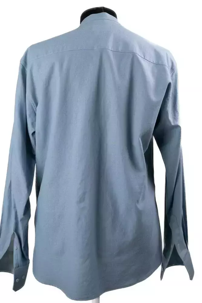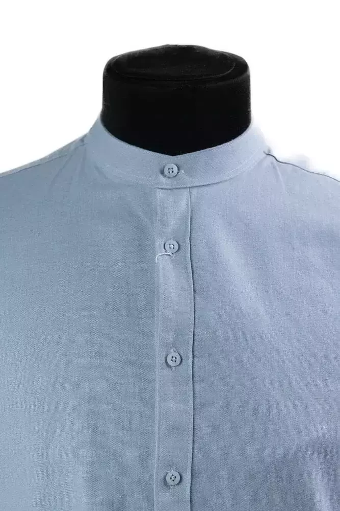 Сорочка чоловіча блакитна однотонна з котону у блакитному кольорі. Однотонний дизайн. Крій slim fit. Комір на стійку. Склад: 100% котон. Підходить для всіх сезонів. Для офісу, подій і щоденного носіння. Поєднується зі штанами, піджаком і жилеткою.