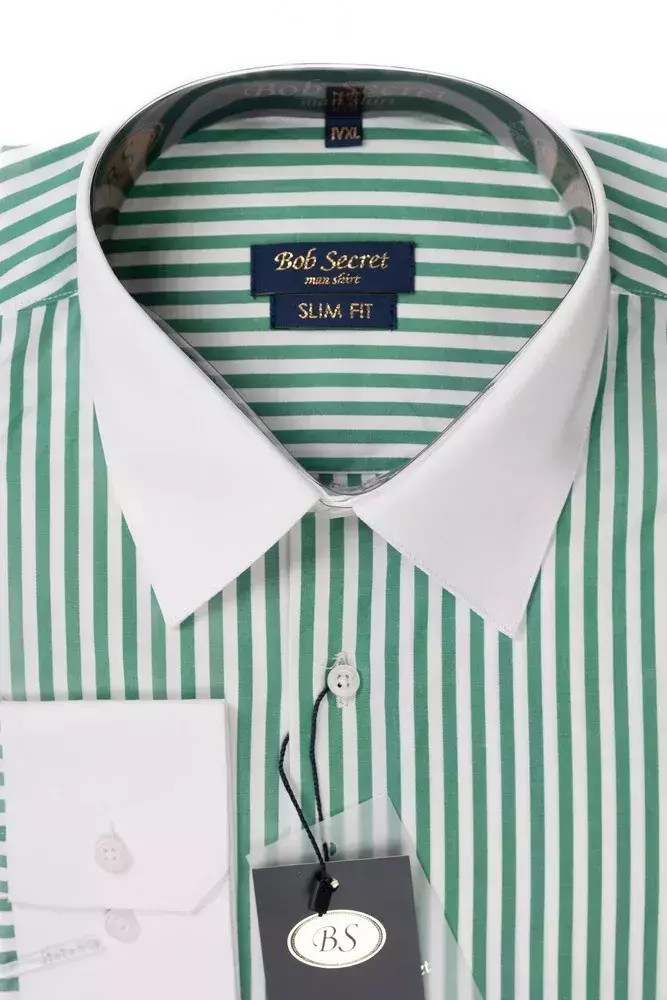Сорочка чоловіча зелена у смужку у зеленому кольорі. Дизайн у смужку. Крій slim fit. Класичний комір. Склад: котон 80%, поліестер 20%. Підходить для всіх сезонів. Для офісу, подій і щоденного носіння. Поєднується зі штанами, піджаком і жилеткою.