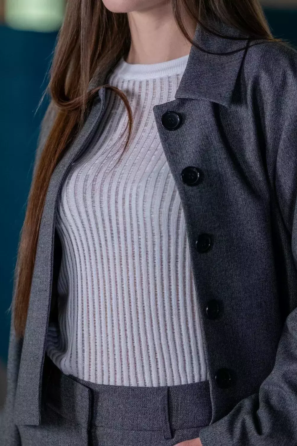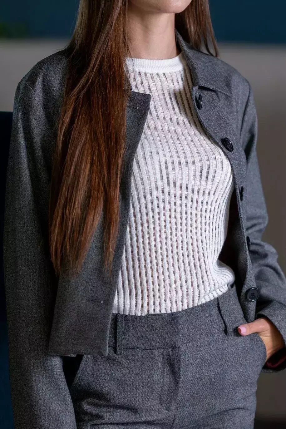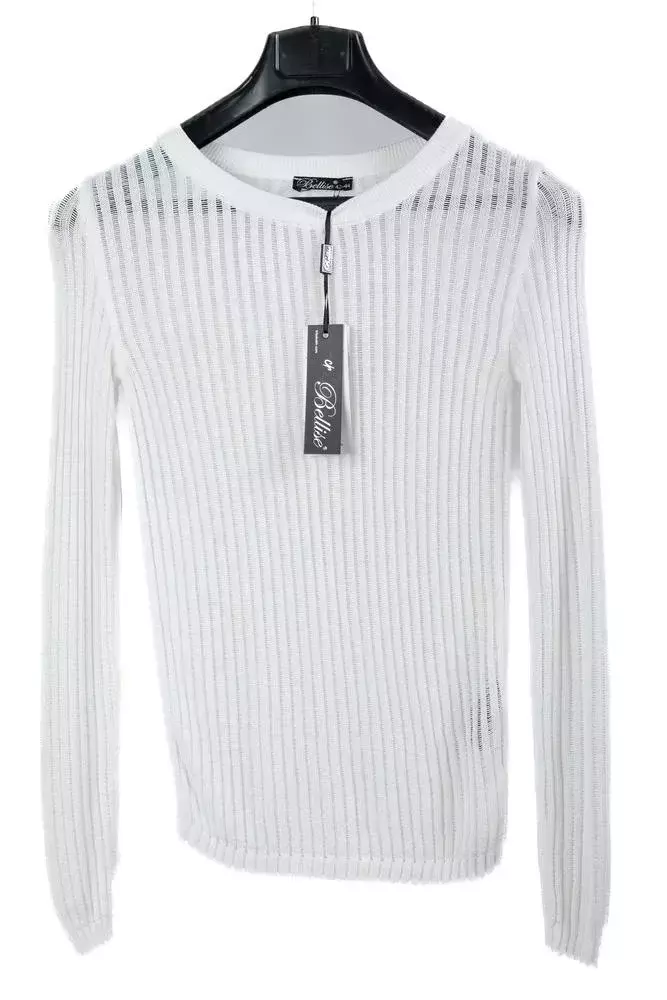Лонгслів жіночий білий у білому кольорі. Дизайн у смужку. Склад: 60% бавовна, 40% віскоза. Для прохолодної погоди та щоденного носіння. Поєднується зі штанами, піджаком і пальтом.