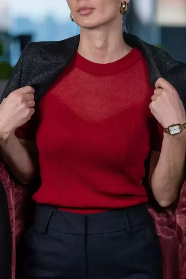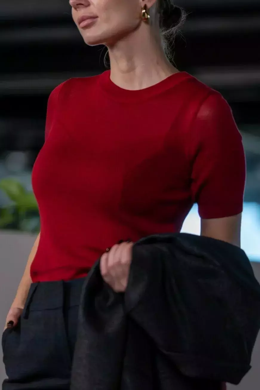 Топ жіночий червоний у червоному кольорі. Однотонний дизайн. Склад: 70% віскоза, 25% бавовна, 5% поліамід. Для щоденного носіння.