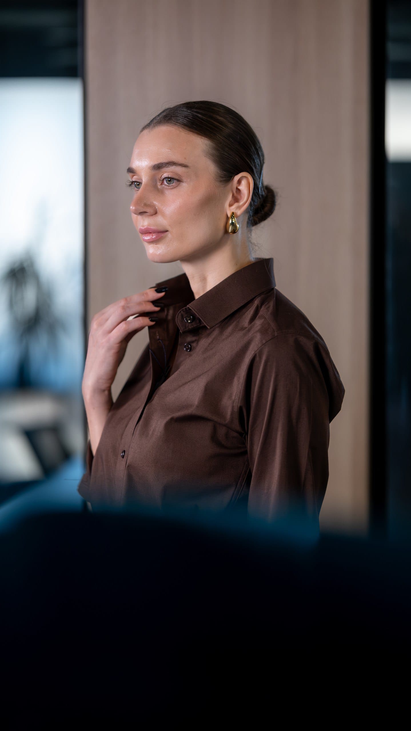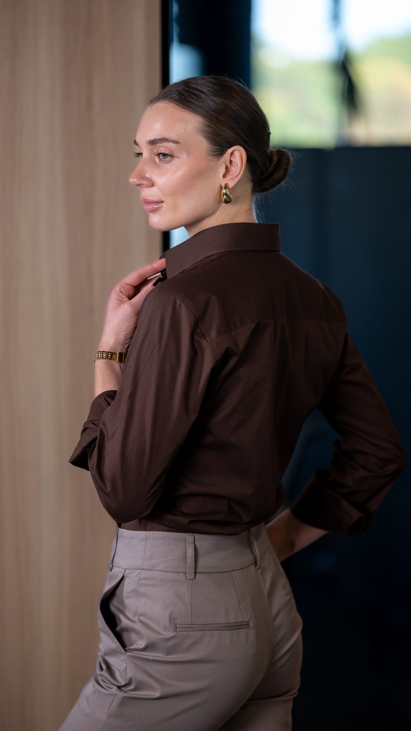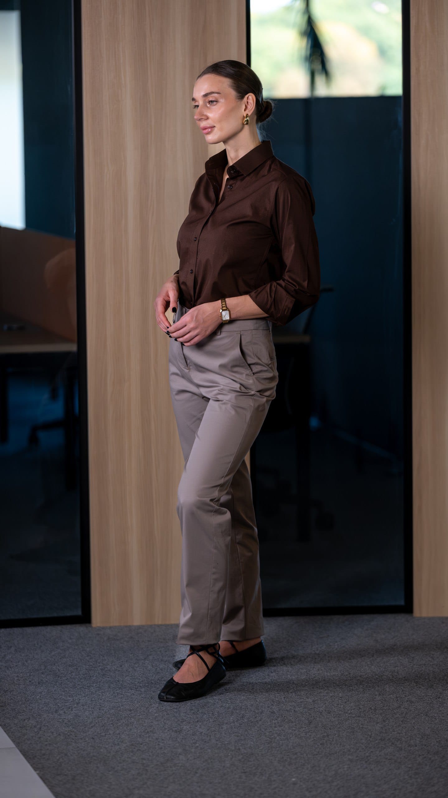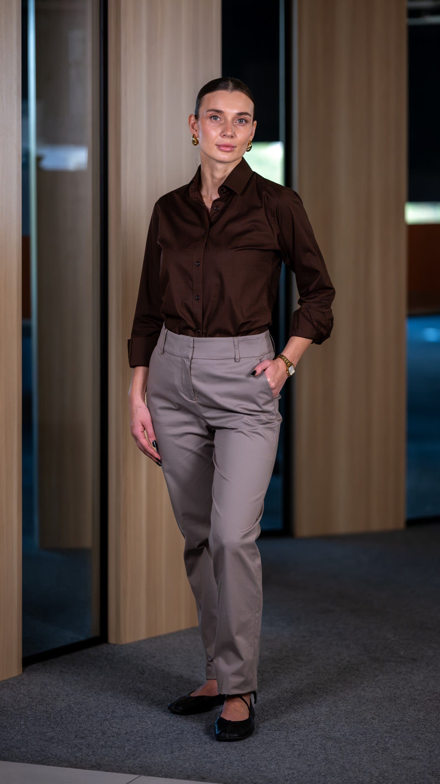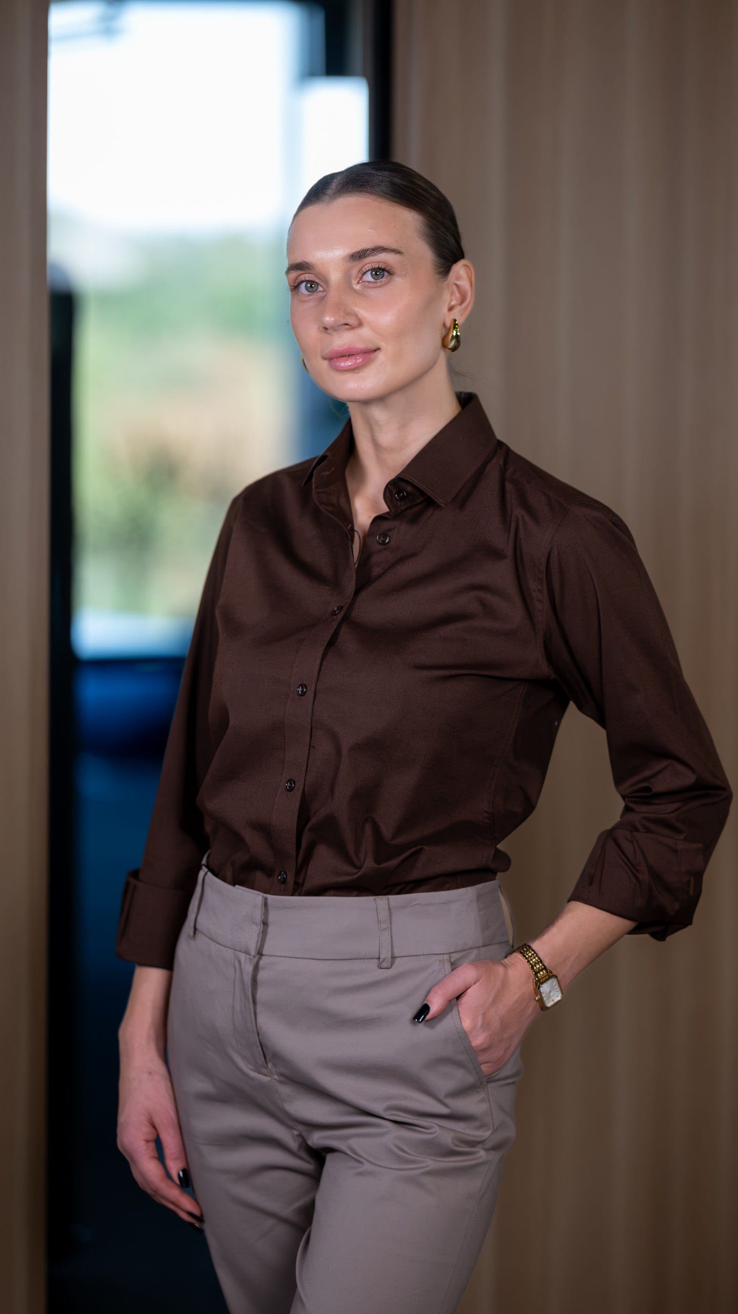 Сорочка жіноча коричнева у коричневому кольорі. Однотонний дизайн. Крій slim fit. Класичний комір. Склад: котон 80%, поліестер 20%. Підходить для всіх сезонів. Для офісу, подій і щоденного носіння. Поєднується зі штанами, піджаком і жилеткою.
