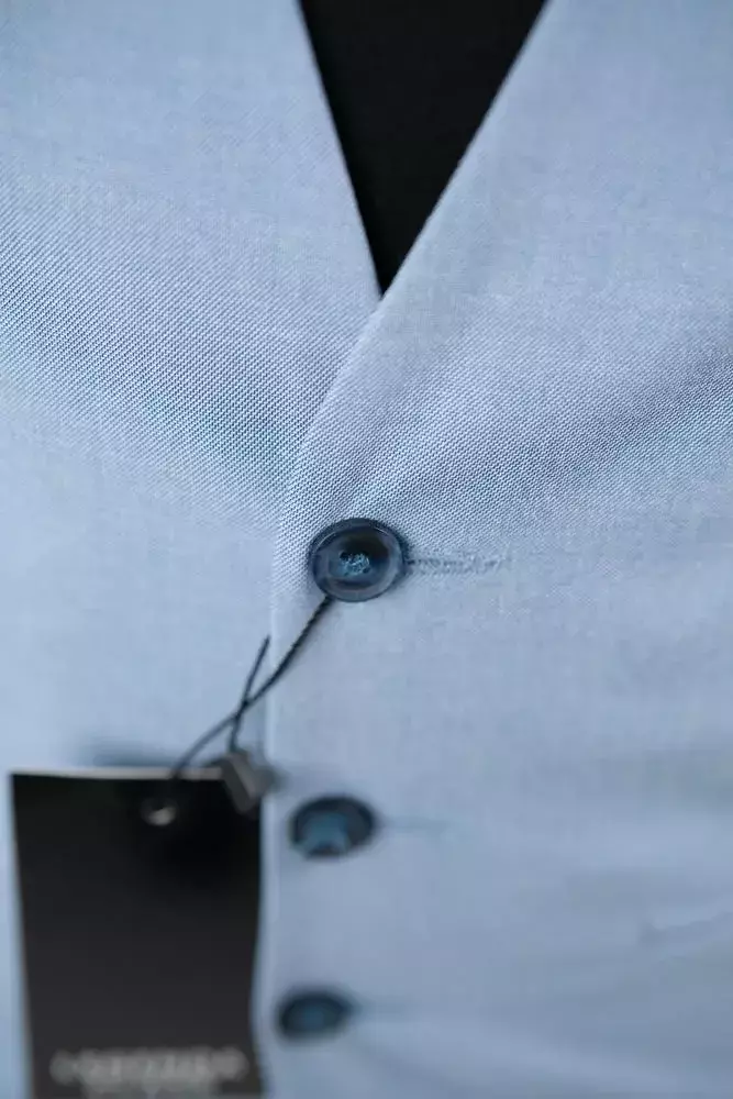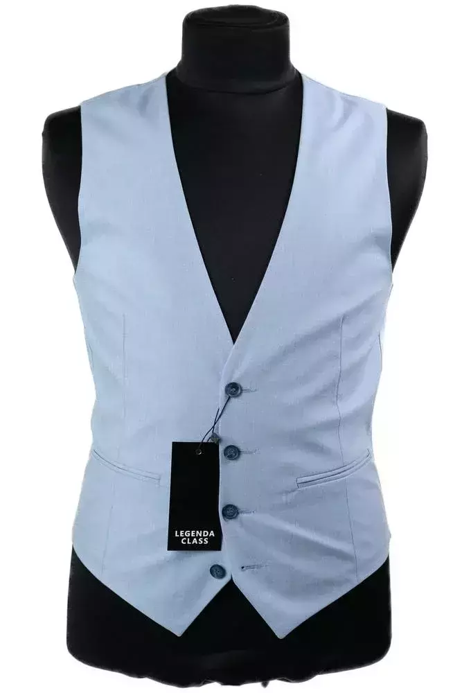 Жилетка чоловіча блакитна однотонна у блакитному кольорі. Однотонний дизайн. Крій slim fit. Склад: 78% віскоза, 19% поліестер, 3% еластан. Підходить для всіх сезонів. Для костюмних комплектів, офісу та урочистих подій. Поєднується з піджаком, штанами та сорочкою.