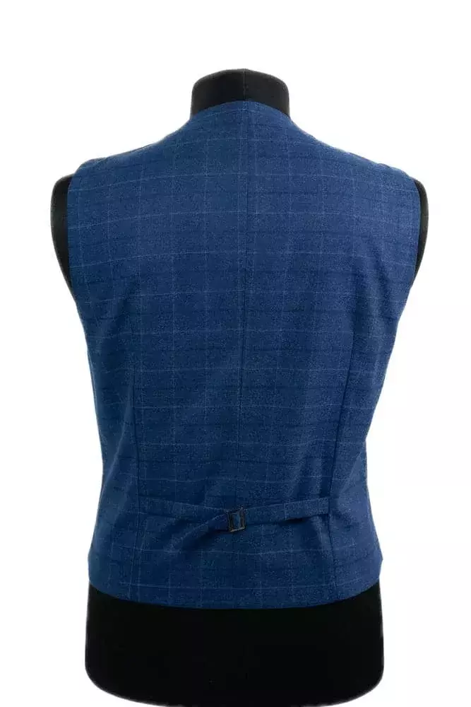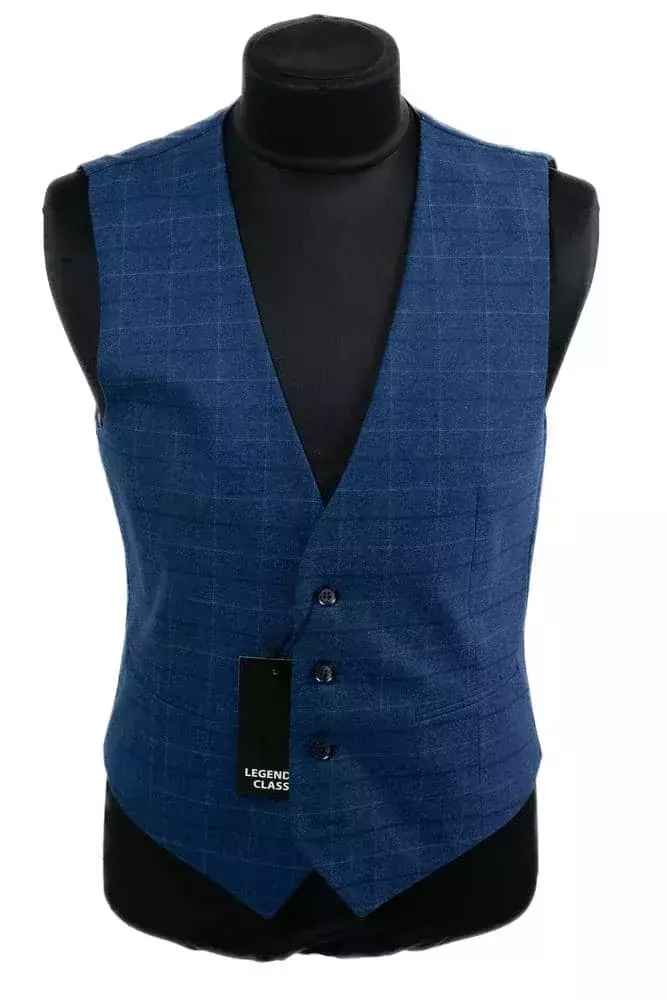 Жилетка чоловіча синя в клітинку у синьому кольорі. Дизайн у клітинку. Крій slim fit. Склад: 85% вовна, 10% поліестер, 5% віскоза. Підходить для всіх сезонів. Для костюмних комплектів, офісу та урочистих подій. Поєднується з піджаком, штанами та сорочкою.