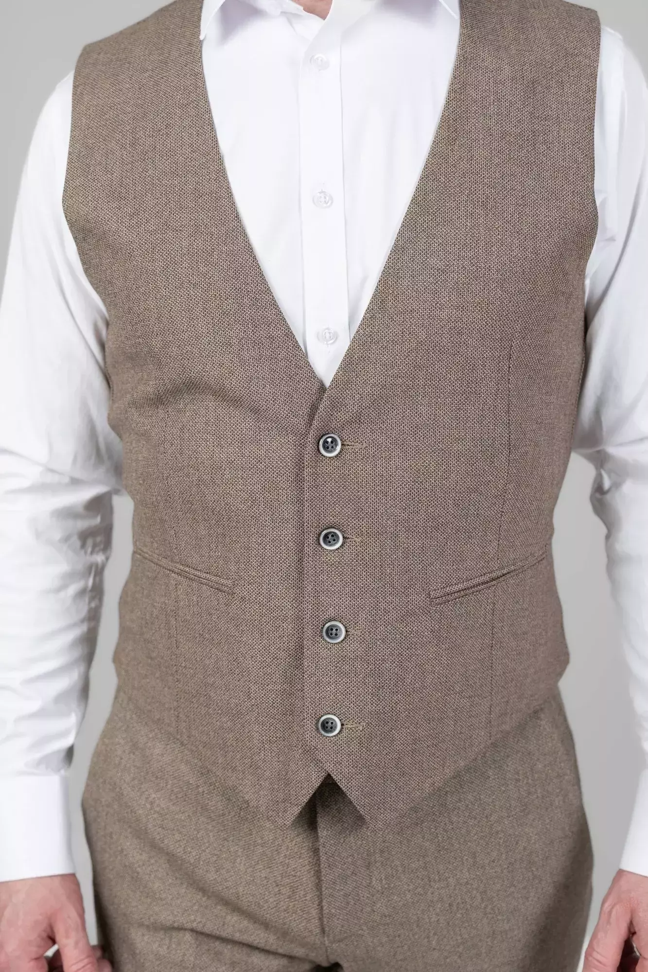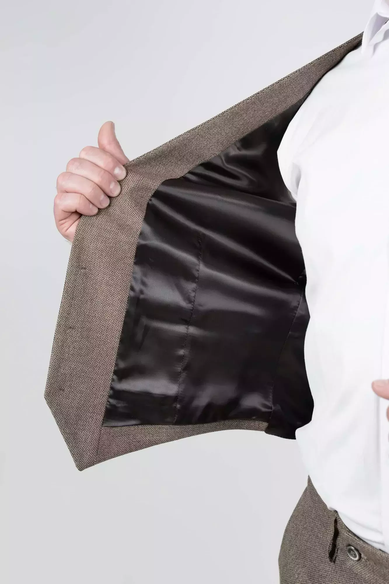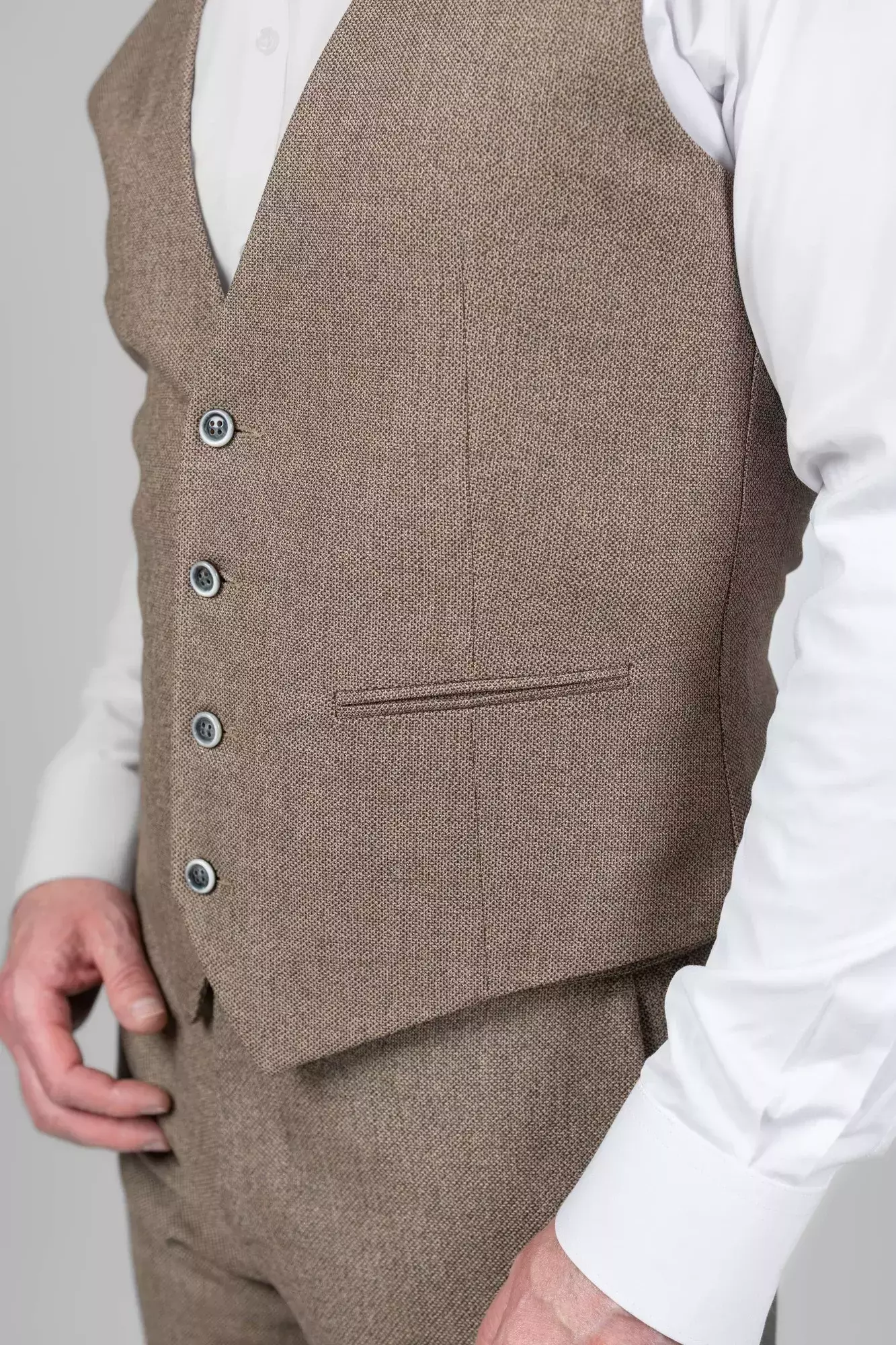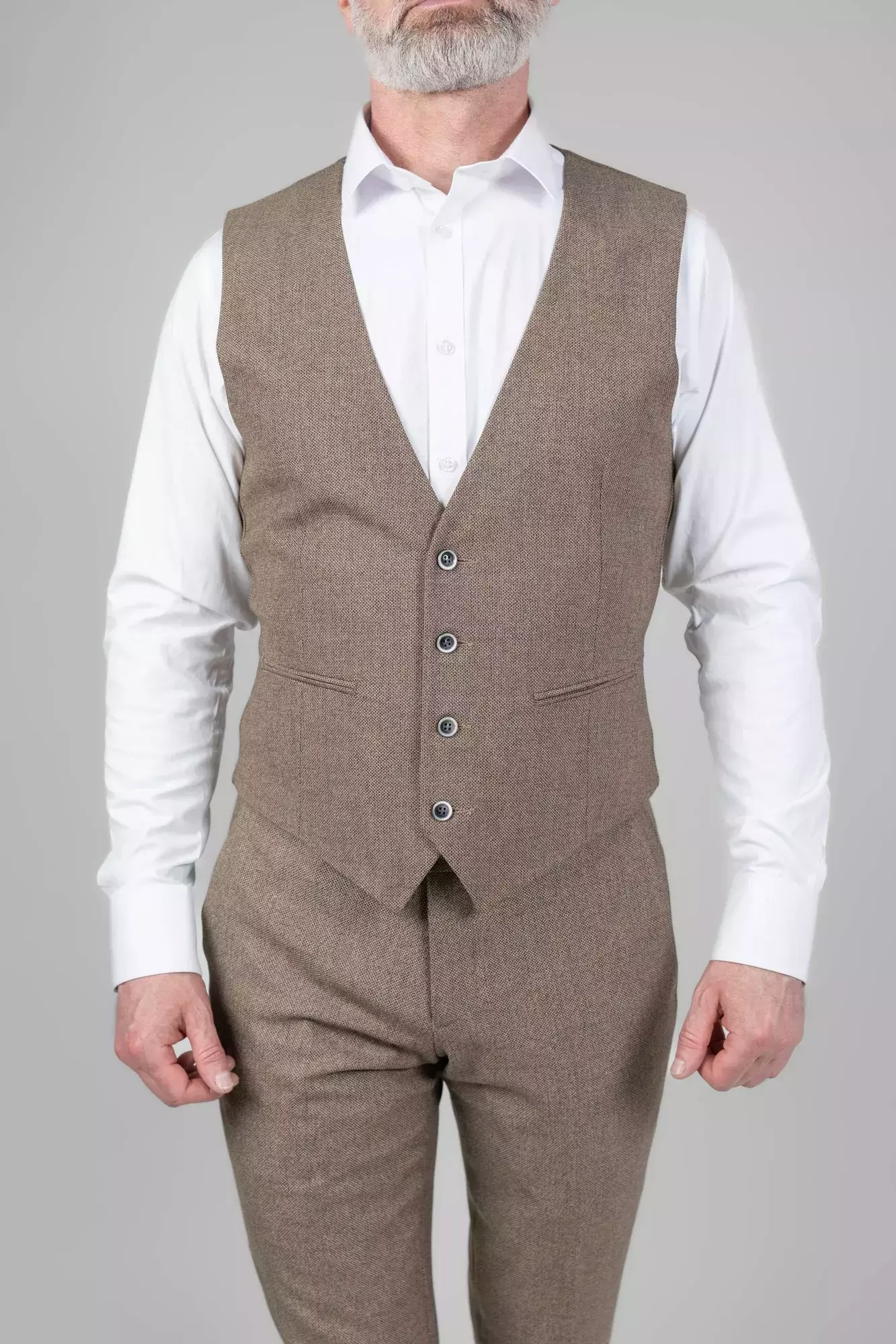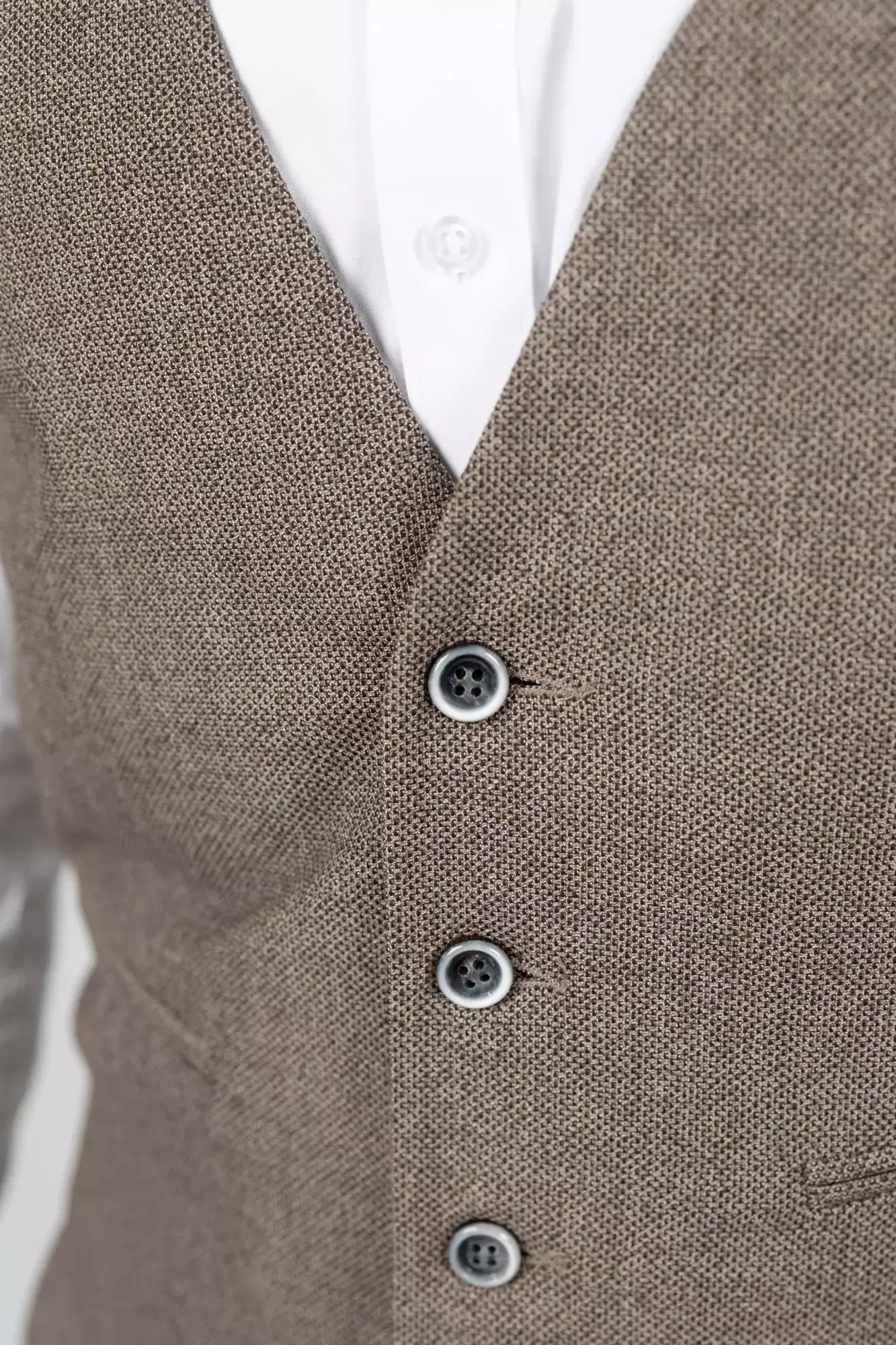 Жилетка чоловіча коричнева однотонна у коричневому кольорі. Однотонний дизайн. Крій slim fit. Склад: 71% вовна, 24% віскоза, 5% еластан. Підходить для всіх сезонів. Для костюмних комплектів, офісу та урочистих подій. Поєднується з піджаком, штанами та сорочкою.