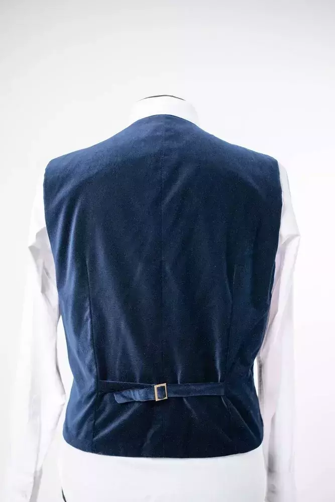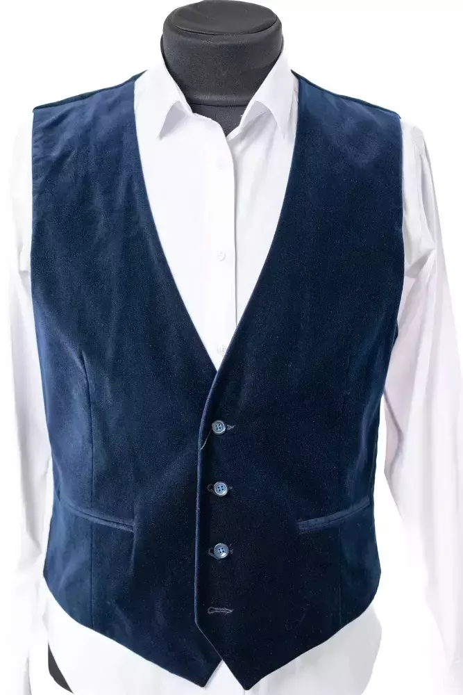 Жилетка чоловіча синя однотонна з велюру у синьому кольорі. Однотонний дизайн. Крій slim fit. Склад: 85% вовна, 10% поліестер, 5% віскоза. Підходить для всіх сезонів. Для костюмних комплектів, офісу та урочистих подій. Поєднується з піджаком, штанами та сорочкою.